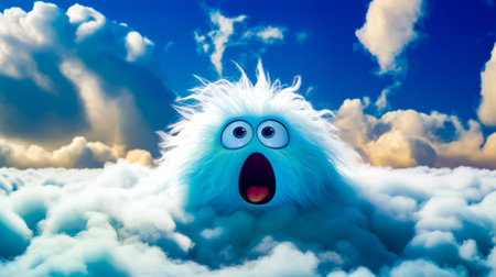 Very cute furry creature in the clouds with his mouth open and eyes wide open. Generative AI.