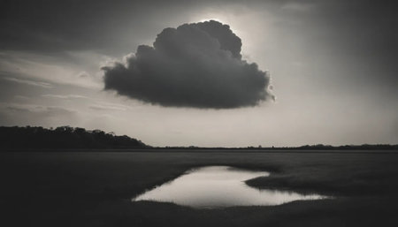 a person standing alone in a foggy field, with a dark storm cloud instead of a head, gentle rain falling,