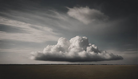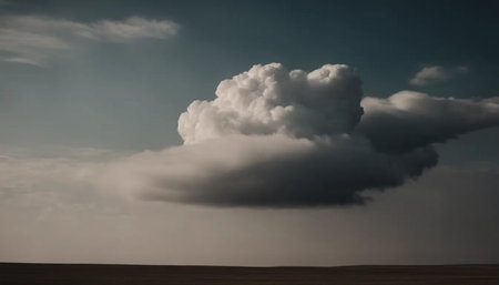 A large cloud in the sky with a dark background. The cloud is white and fluffy, and it looks like it's about to rain. Scene is calm and peaceful, as the cloud is not too big or too small