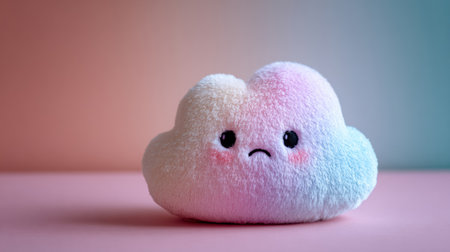 Kawaii cloud plushie with a sweet smiling face, surrounded by fluffy cotton-like clouds and dreamy candy-colored light