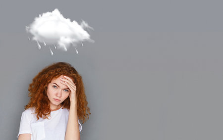 Redhaired girl holding her head with hand under rainy cloud