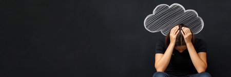 Young woman suffering from mental health problems holding her head with a drawn cloud above symbolizing negative thinking and expressing the concept of confusion, depression, and emotional stress