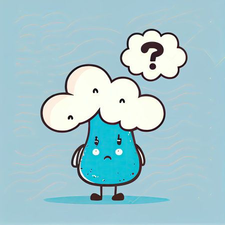 cute cloud cartoon character with questions sign over his head, cartoon style, modern simple illustration