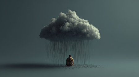 A symbolic 3D image of a person sitting beneath a dark rain cloud, illustrating feelings of sadness, stress, and emotional overwhelm often associated with anxiety.