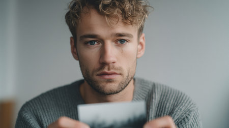 A person contemplates deep feelings of shame and guilt while holding a photograph indoors