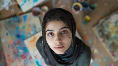 The close up picture of the woman is looking at camera inside her workshop that has been filled with various colourful colour on her background, the artist require creativity and art technique. AIG43.
