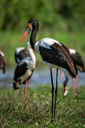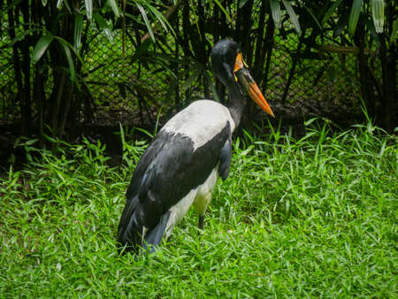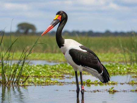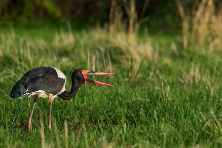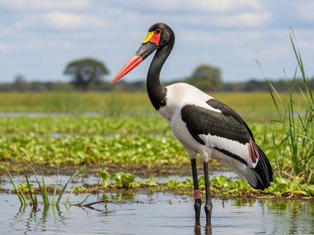 Close up portrait of a colorful saddle-billed stork, Ephippiorhynchus senegalensis, standing in a green meadow.