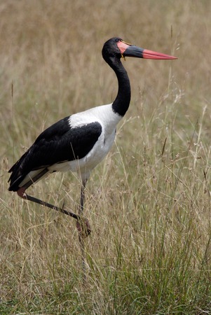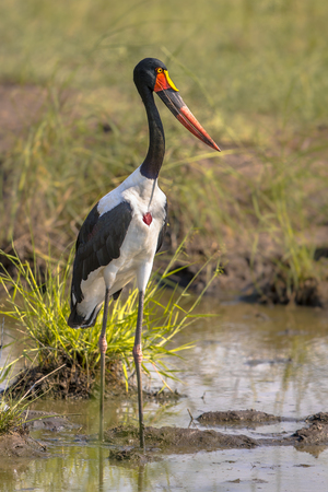 Single Saddle-billed Stork (Ephippiorhynchus senegalensis) standing in grass in Okavango Delta, Botswana