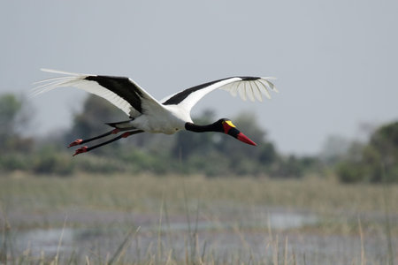 Saddle-billed stork (Ephippiorhynchus senegalensis) flying over the Okavango Delta, Botswana.