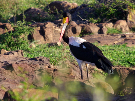 Saddle Billed Stalk walking into the African bush. Photo taken in South Luangwa, Zambia.