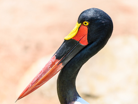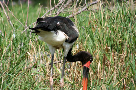 Heads of two black and white jabirus birds of Senegal, Africa, white their wonderful red long beak