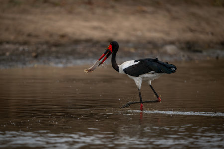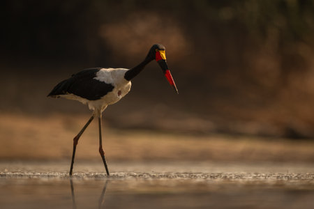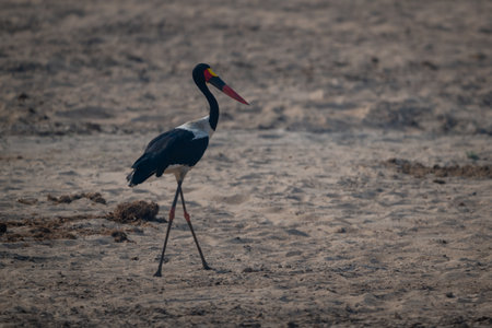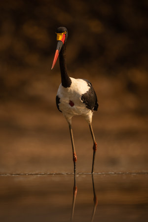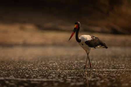 Saddle-billed stork (Ephippiorhynchus senegalensis) wading and standing in muddy pond in Kruger national park South Africa