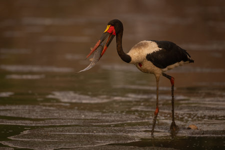 Saddlebilled Stork (Ephippiorhynchus senegalensis) feeding on fish in a shallow lagoon at the start of the rainy season in South Luangwa National Park, Zambia
