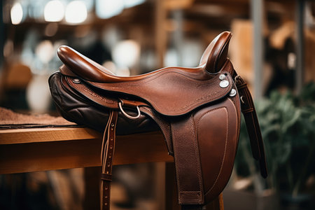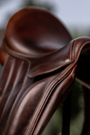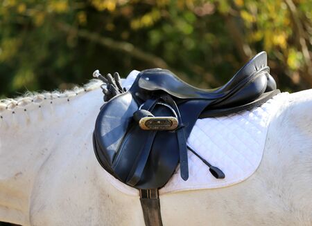 Close up equestrian gear saddle and stirrups prepped for summer olympic competition