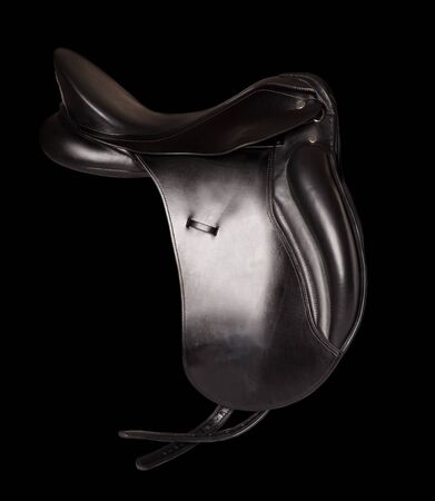 Black sports saddle. Horse ammunition. Equestrian sport.
