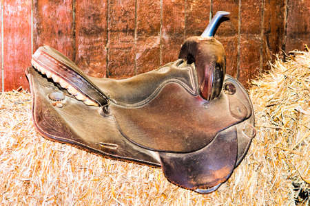 old leather saddle is like a decoration on a pile of hay