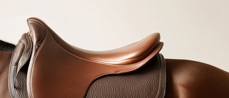 High-quality leather saddle mounted on a horse, showcasing equestrian equipment, riding style, and craftsmanship.