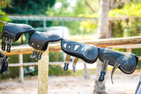 Saddle brown on fence against the wooden wall. Sport leather saddle, harness for horses on daylight. Western horse saddles on a rack, ready for dressage training. Equestrian sport background, vintage