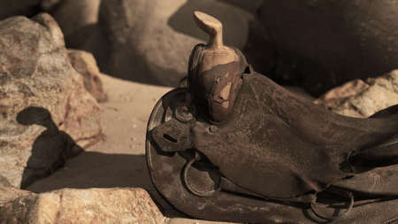 old horse saddle on sand beach