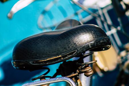 BELGRADE, SERBIA - APRIL 18, 2018: Detail of the vintage Brooks England bicycle saddle in Belgrade, Serbia. Brooks England is a bicycle saddle manufacturer founded at 1866 in Birmingham.