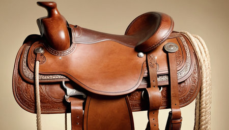 Close up of a saddle with rope on a beige background.