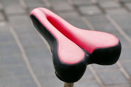 Pink women's saddle for a Bicycle on a gray background. Special Bicycle saddle. Equipment for outdoor activities