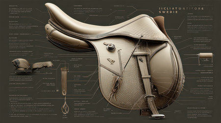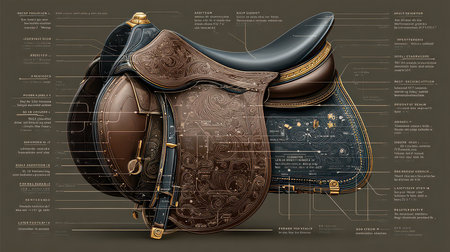 This image presents a comprehensive diagram of a horse saddle, highlighting its features and construction specifications for educational purposes in equestrian contexts.