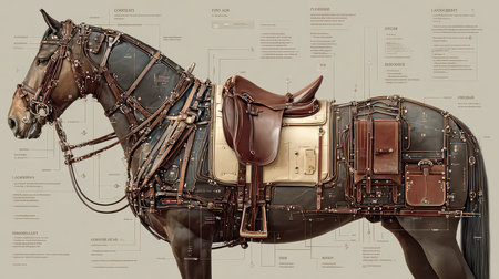 Explore the intricate details of harness and saddle equipment on a horse. This image showcases the artistry of leather craftsmanship, highlighting various components essential for riding.