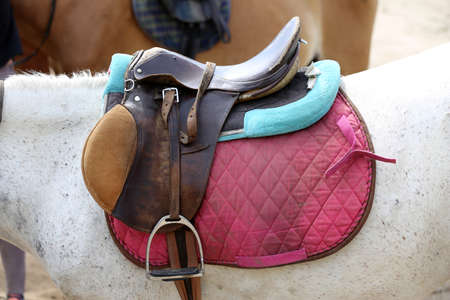 Prepared english saddle with stirrups. Dressage of horses club. Equestrian sport and hobby