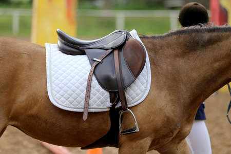Old leather saddle with stirrups for show jumping race Saddle on a back of a sport horse. Equestrian sport event background