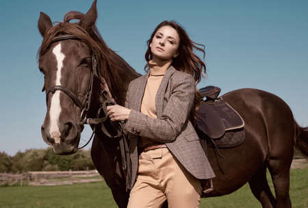 Portrait of a gorgeous brunette woman in an elegant checkered brown jacket posing with a horse on country landscape