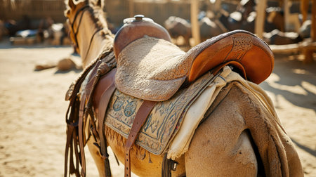 Camel saddle and desert background, a symbol of Dubai culture. Copy space