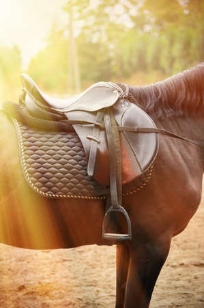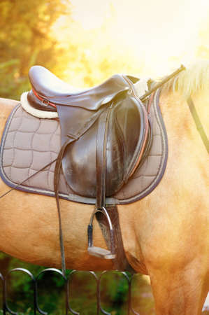 On the back of the horse, a brown leather saddle and saddle cloth are worn on top. Illuminated by sunlight ready for equestrian training outdoor
