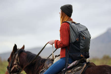 beautiful cheerful young woman enjoy and ride her brown cute horse in friendship and relationship. animal lover and pet therapy concept.