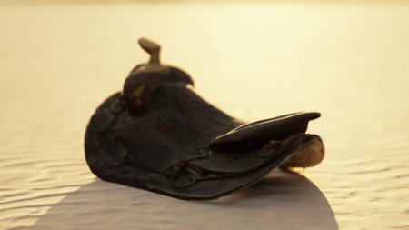 A beautifully crafted cowboy saddle rests on the sandy shore, glistening in the sunset light. The tranquil atmosphere captures the essence of rugged outdoor adventures and western heritage.