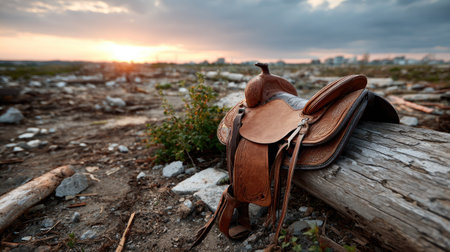 A beautiful leather saddle rests on a weathered log, capturing the essence of rustic charm against a dramatic sunset landscape. This image evokes serenity and adventure.
