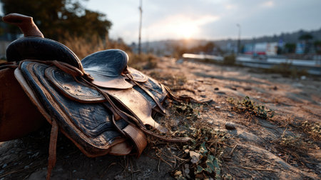 A rustic leather saddle rests on the ground, illuminated by a warm sunset, capturing the essence of the outdoor cowboy lifestyle in a serene landscape.