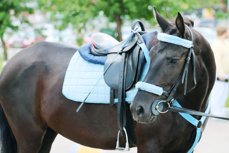 The dark bay horse is wearing a black bridle, a leather saddle, a metal stirrup and a beige saddlecloth. Equestrian sports equipment. Horse riding.