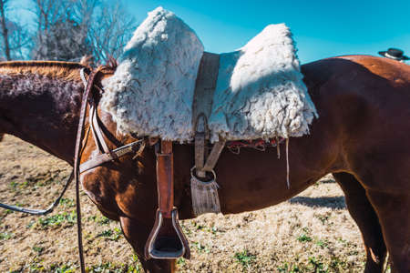 Detailed close up of horse saddle with stirrup. Equestrian rural objects concept.