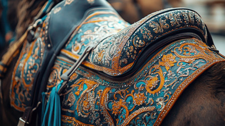 Beautifully decorated camel saddle, symbolizing Dubai heritage. Copy space