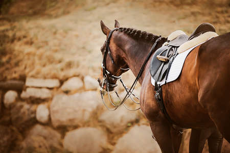 portrait of horse at an equestrian competition. close-up. dressage or outdoor training