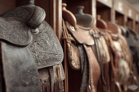 Intricately designed leather western saddles hang in a rustic barn setting, detailed craftsmanship and traditional equestrian gear. soft lighting emphasizes the texture and elegance of these essential riding accessories. Generative AI