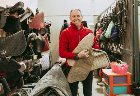 A stunning depiction of a brown horse equipped with a western saddle, surrounded by various grooming supplies. This image captures the essence of equestrian care and connection.