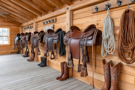 Western horse riding equipment stored on wall in barn with lasso and cowboy boots