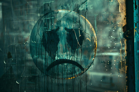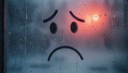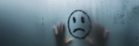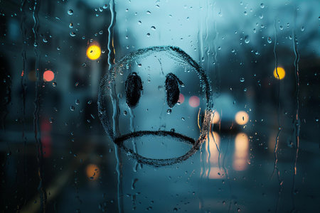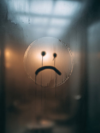 A sad emoji face is depicted on a fogged glass window, surrounded by a moody ambiance, creating an emotional and reflective scene. The left area remains blank.