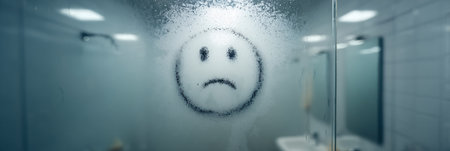 A foggy mirror shows a finger-drawn sad face, symbolizing illness, while the clear upper section heightens the emotional effect in the bathroom.