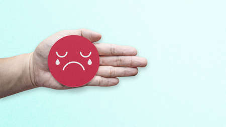 Hand holding red paper with unhappy emotion face. Customer review satisfaction feedback survey.