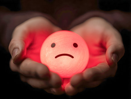 A hand delicately cradles a luminous crimson sphere bearing a sorrowful face, evoking feelings of fragility and sorrow against a shadowy backdrop.