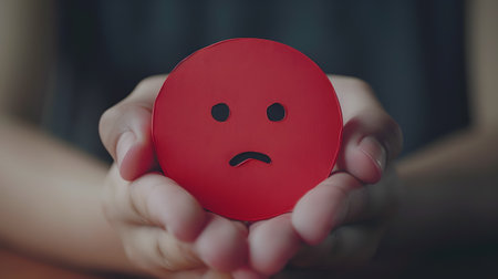 A person holds a sad face symbol, reflecting emotions and the complexity of feelings we often hide. world mental health day concept