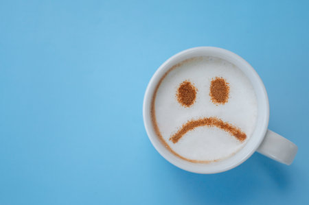 A sad face smiley on coffee foam in a mug on a blue background. High quality photo